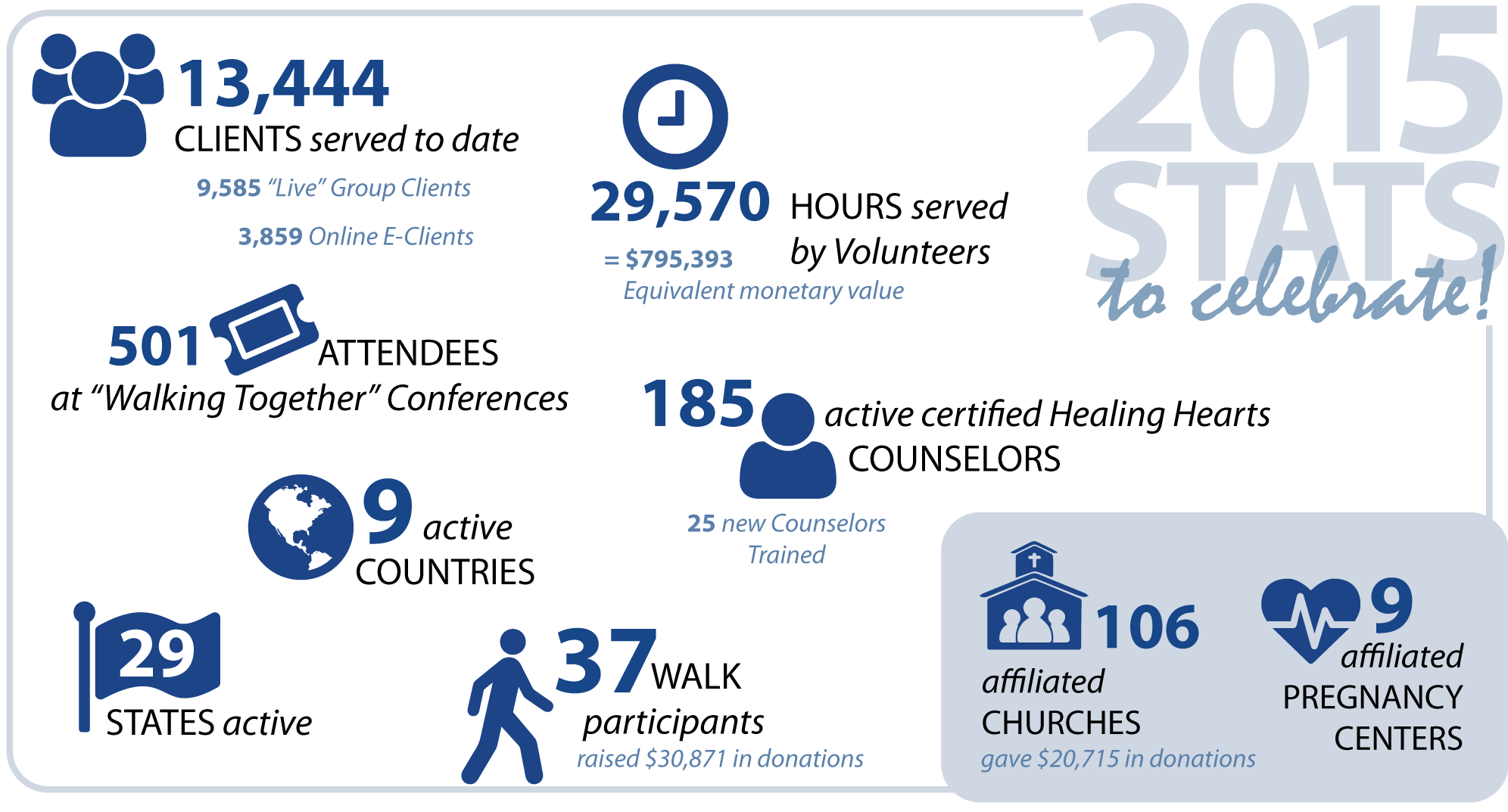 It is no small thing what God is doing through Healing Hearts Ministries. There is an inexpressable joy in watching how God assembles and orchestrates the compassion, time, and talents of our office staff, volunteer counselors, and you, our dedicated supporters. Let's praise Him for what He's done in 2015:
