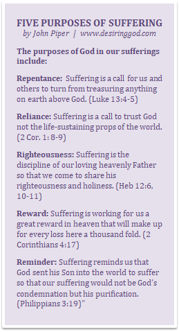 There are many reasons why God may allow suffering in our lives. Even though your suffering may be different from mine, I am convinced we can know that God always has a purpose in it. The attached excerpt from John Piper has helped me put my thoughts into perspective. May it be a help and comfort to you as well.