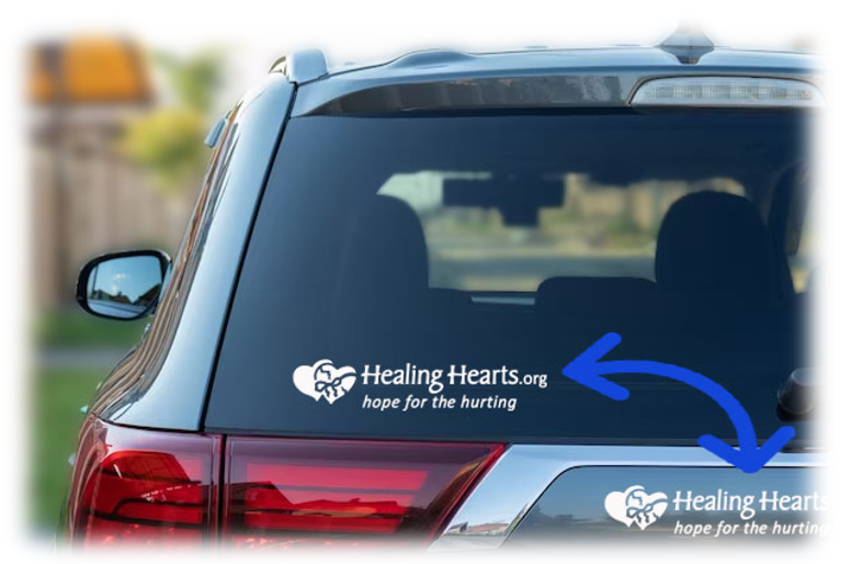 We are very excited to introduce another practical way for you to support us. Tell the world that Healing Hearts is here to offer “hope for the hurting.” It can also serve as a great reminder for you to pray for us. At just $5.00, these 10.75” by 2.25” durable vinyl decals make a great gift and conversation piece. You can order yours today at healinghearts.org/decals.