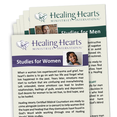 These rack cards highlight our Women's studies on one side and Men's studies on the other. They can be used to reach out to your friends, your church body, or your community, to help them discover the answers Healing Hearts offers for finding hope & healing. When a man or woman begins to face the reality of their pain and hurt, they often suffer silently, too ashamed to confide in their pastor, family or friends for fear of trivializing their anxieties or being judged. These materials are written to reach out to the "walking wounded," to tell them that they are not alone and that there is lasting healing available for them. Whether you are considering making them available in your office, church, or some other establishment, these rack cards are ideally suited to be placed in restrooms. Due to the aftermath of regret, guilt, shame, and torment that surrounds these traumatic issues, a restroom is one place a person can pick up a brochure with privacy. If the location is not private, they may never take one. You can buy literature holders and affix the holder to a wall or door. Then, regularly check to see how many are missing, and replenish as needed. With any of our studies, once a person completes a Bible study, as a result of his or her own healing, they may sense God's leading to minister to others in their own church, leading small-group Bible studies. You could be starting a new ministry in your church by simply making these brochures available to your congregation.