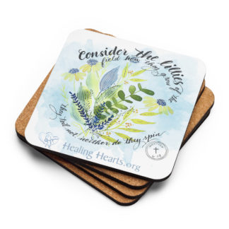 This cork-back coaster features "Heart Reflections" art by watercolor artist Madge Bloom. Consider donating some for your church lobby or office as an outreach to help others discover the life-changing ministry of Healing Hearts. The coaster is waterproof and heat-resistant, designed to last a long time. Buy it for yourself or as a lovely gift for your, friends, family, church, or office.• Hardboard MDF 0.12″ (3 mm)